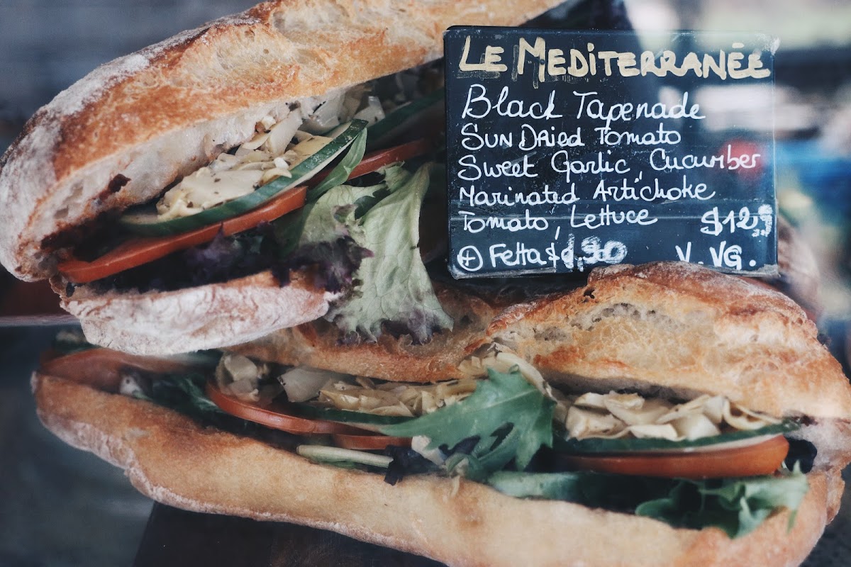 SOURDOUGH CIABATTA, BLACK TAPENADE, SUN-DRIED TOMATOES, SWEET GARLIC, ARTICHOKES, MIXED LEAVES, TOMATO AND CUCUMBER